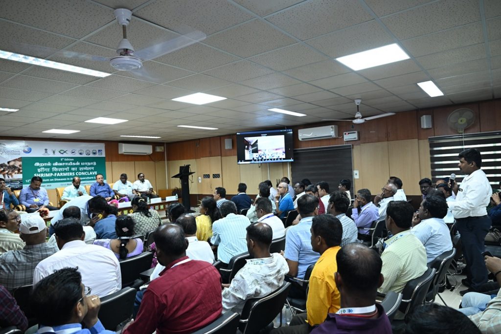 As a part of DAA12, the 5th Edition of Shrimp Farmers Conclave-2025 was organised on 27th September, 2025 as the final event of the international convention, wherein more than 50 farmers, stakeholders and other participants of the symposium. Shri. K.C. Devasenapathy, IAS, secretary, the Coastal Aquaculture Authority, Govt. of India participated as the Chief Guest and interacted with the participants. During the conclave institutional support for shrimp farming from the Coastal Aquaculture Authority, MPEDA and the NFDB were informed to the shrimp farmers. Subsequently, shrimp farmers shred their experiences and success stories in prevention and management of aquatic diseases.