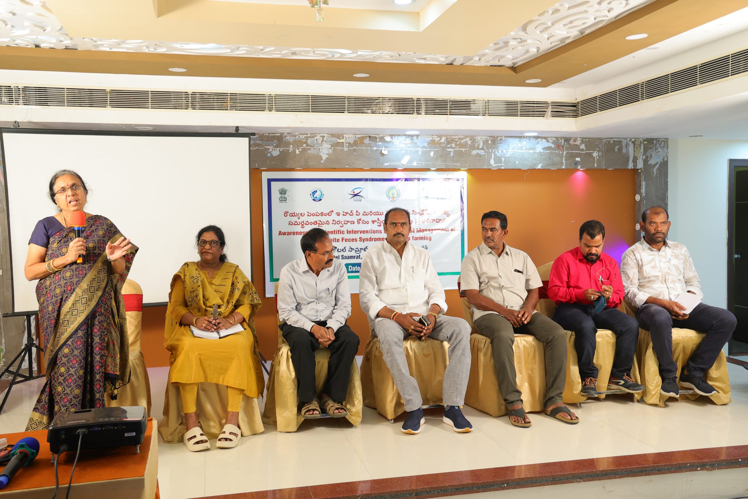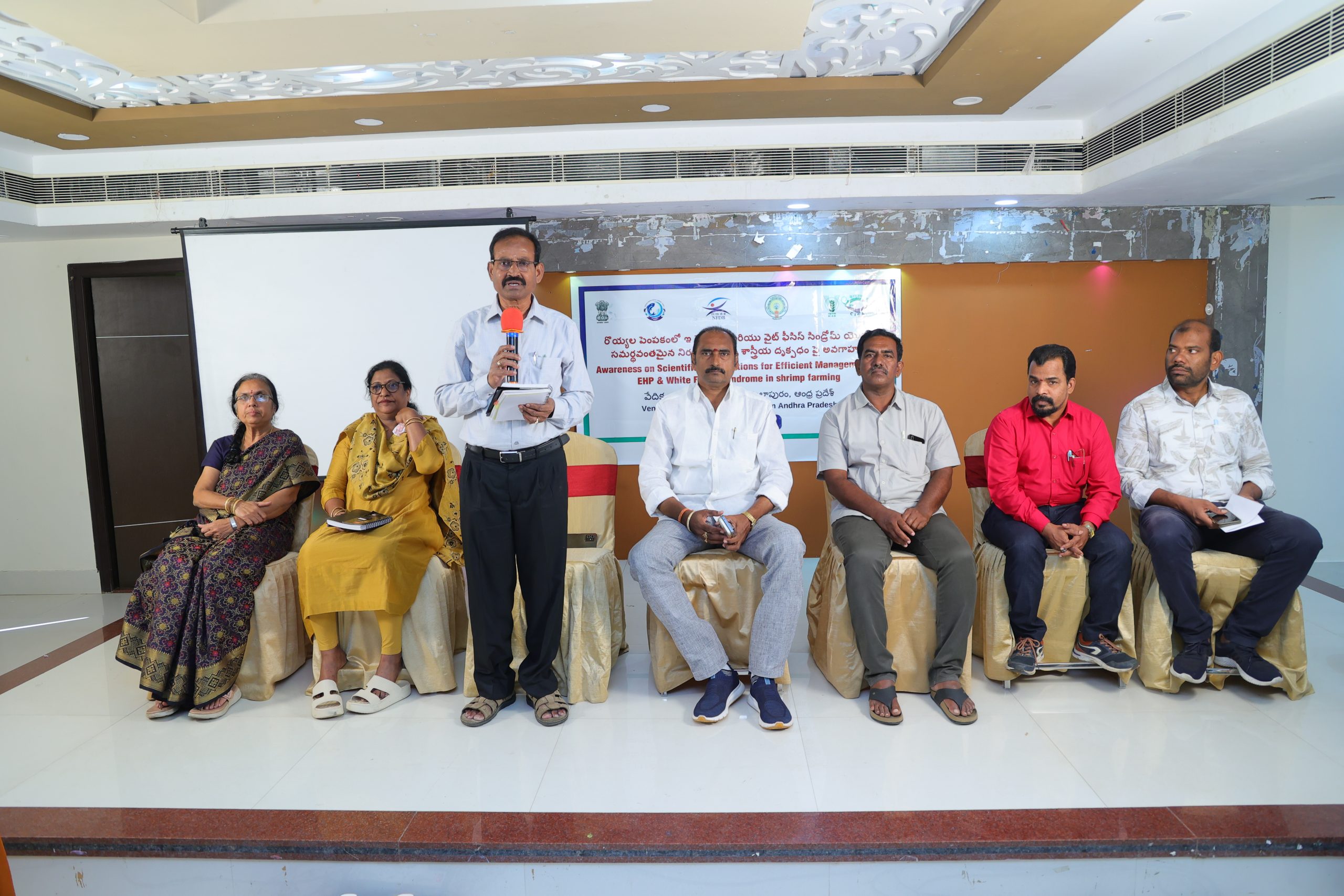 Dr S. Anjali, Additional Director, Principal, SIFT, Department of Fisheries, Government of Andhra Pradesh, Mr. P.V. Srinivasa Rao, District Fisheries Officer, Department of Fisheries, Government of Andhra Pradesh, Mr. Desam Setty Lakshminarayan, Director, APSADA, and Mr. Nagasrinivas, Director, APSADA, attended the meeting and addressed the farmers.