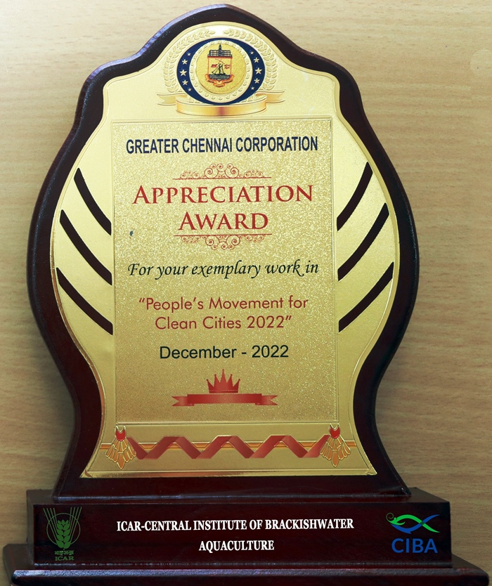 ICAR-Central Institute of Brackishwater Aquaculture (ICAR-CIBA), Chennai received the ‘Appreciation Award’ for the exemplary work in “People’s Movement for Clean Cities -2022” under the Swachh Bharat Mission from the Greater Chennai Corporation, Chennai, Tamil Nadu based on the range and scale of organizing the various swachh activities including innovative waste management to waste-to-wealth initiatives besides documentation and dissemination of the technologies for waste management since 2015. Dr.C.V.Sairam, Director-in-Charge, Dr.P.Mahalakshmi, Principal Scientist & Nodal Officer, Swachh Bharat Mission, ICAR-CIBA and Mr.Jagan Mohan Raj, Member, Swachh Bharat Mission committee of CIBA received the award from the Respectful Mayor of Chennai Ms.Priya Rajan on 26.12.2022.