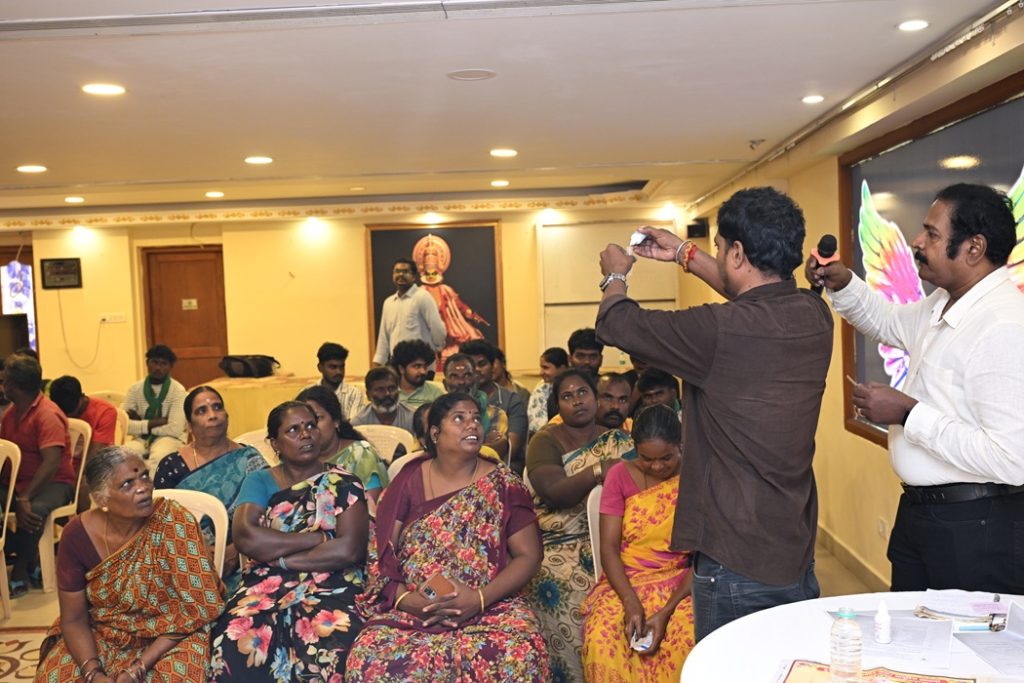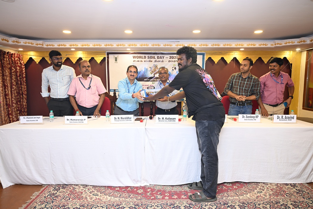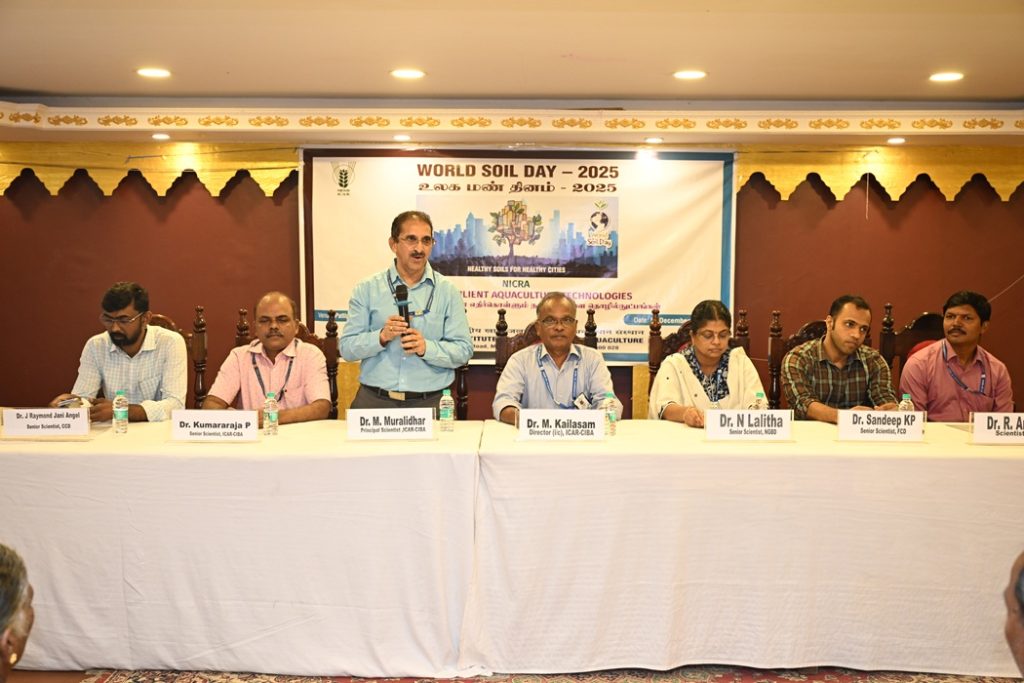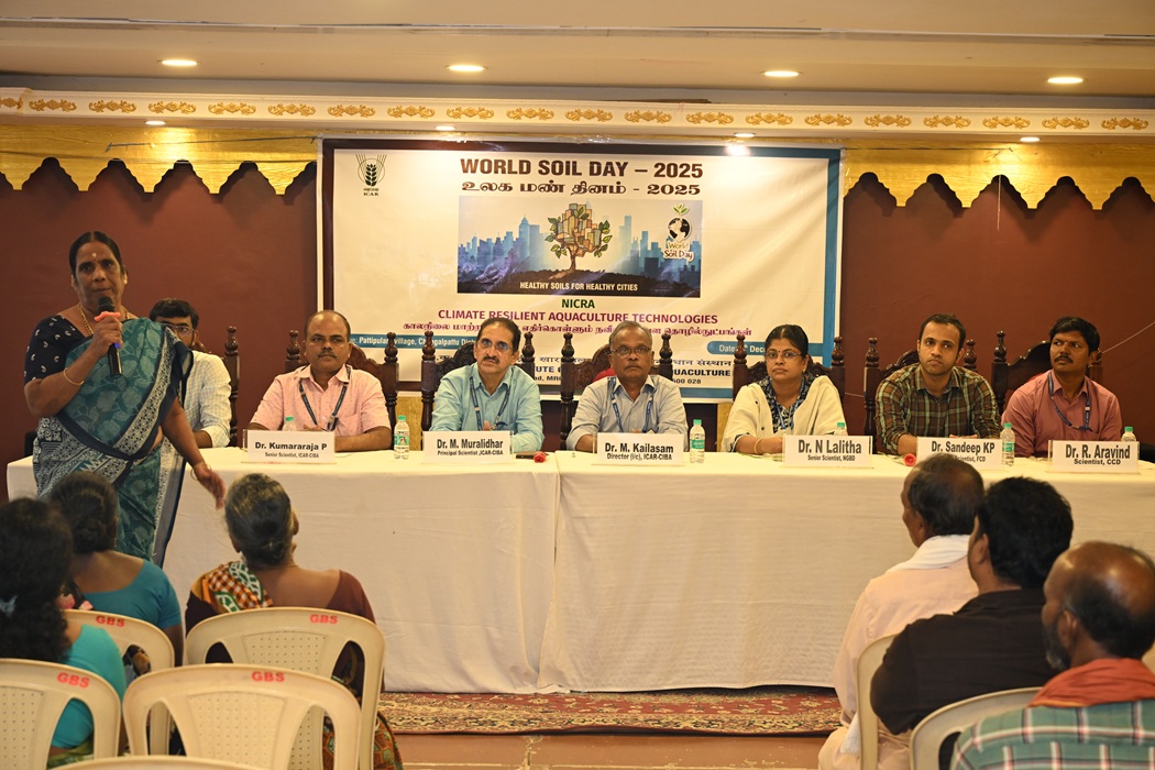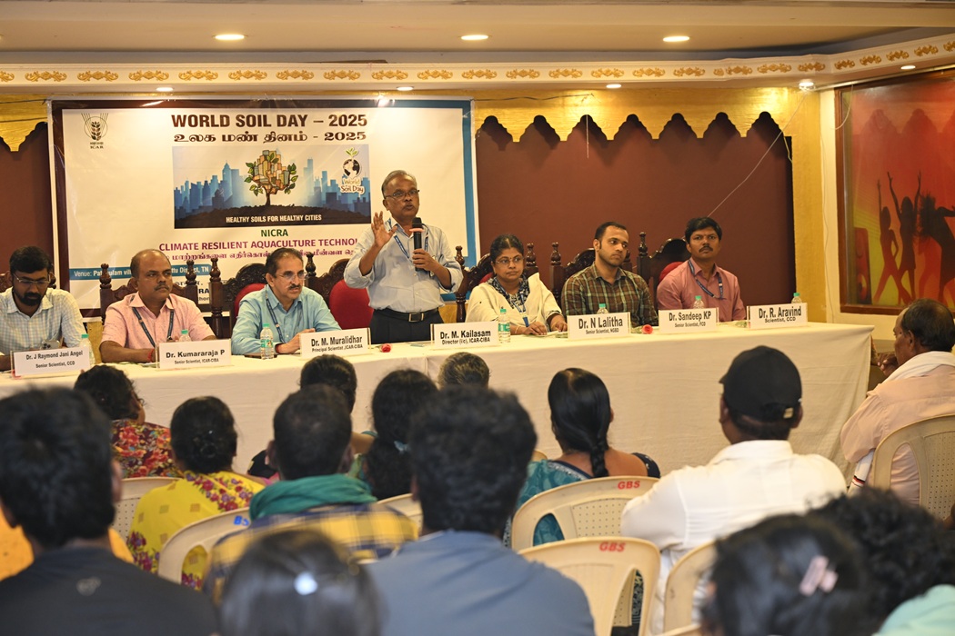 On the occasion of World Soil Day, ICAR-Central Institute of Brackishwater Aquaculture, Chennai organised “Brackishwater Aquaculture Farmers Meet” on “Climate Resilient Aquaculture Technologies” at Pattipulam Village, Chengalpattu District Tamil Nadu on 5th December 2025 under NICRA project. About 80 farmers from the Puthu Nemmelikuppam and Kovalam Villages participated and interacted with the scientific team. Dr. M. Muralidhar, Principal Scientist welcomed the gathering and explained about the importance of world soil day celebration and the current year theme “”Healthy Soils for Healthy Cities”. Senior Scientists, Dr P Kumararaja, Dr N Lalitha, Dr J Raymond Jani Angel and Dr Sandeep KP, and Scientist R Aravind, and Dr. A Nagavel, Chief Technical Officer deliberated on soil and water quality management, health management, crab fattening, Live feeds and shrimp-seaweed integrated farming. Dr. M. Kailasm, HoD, Finfish Culture Division and Director I/c elaborated the institute’s contribution towards brackishwater aquaculture, schemes provided by the central government through different agencies for the upliftment of SCST aquafarmers and adaptation of climate resilient technologies for sustainable brackishwater aquaculture. During the interaction farmers were demonstrated soil sampling protocol and soil quartering process to obtain representative soil samples for analysis. Multi parameter water quality kit was demonstrated for onsite monitoring of water parameters and two kits were distributed to farmers.
