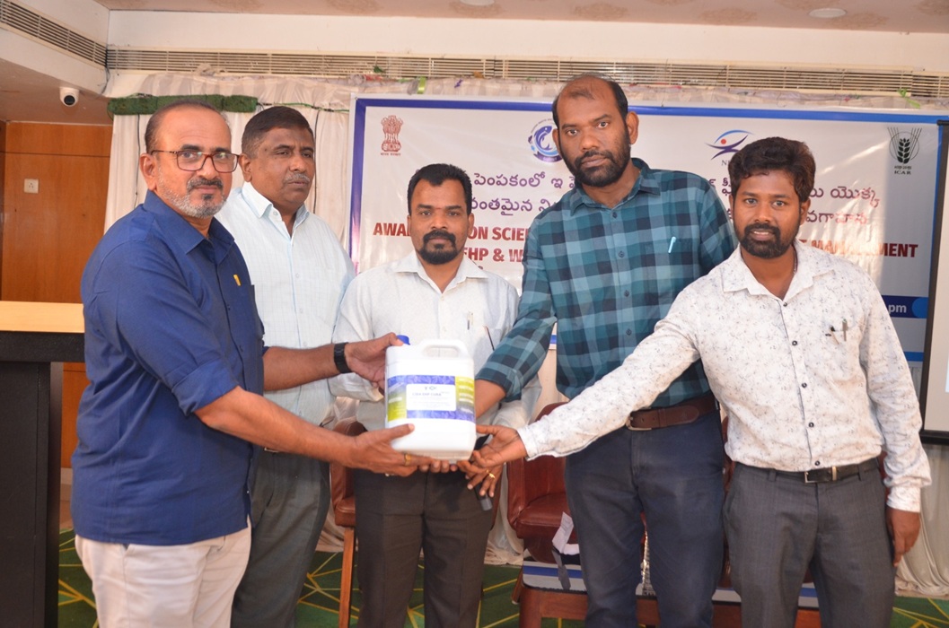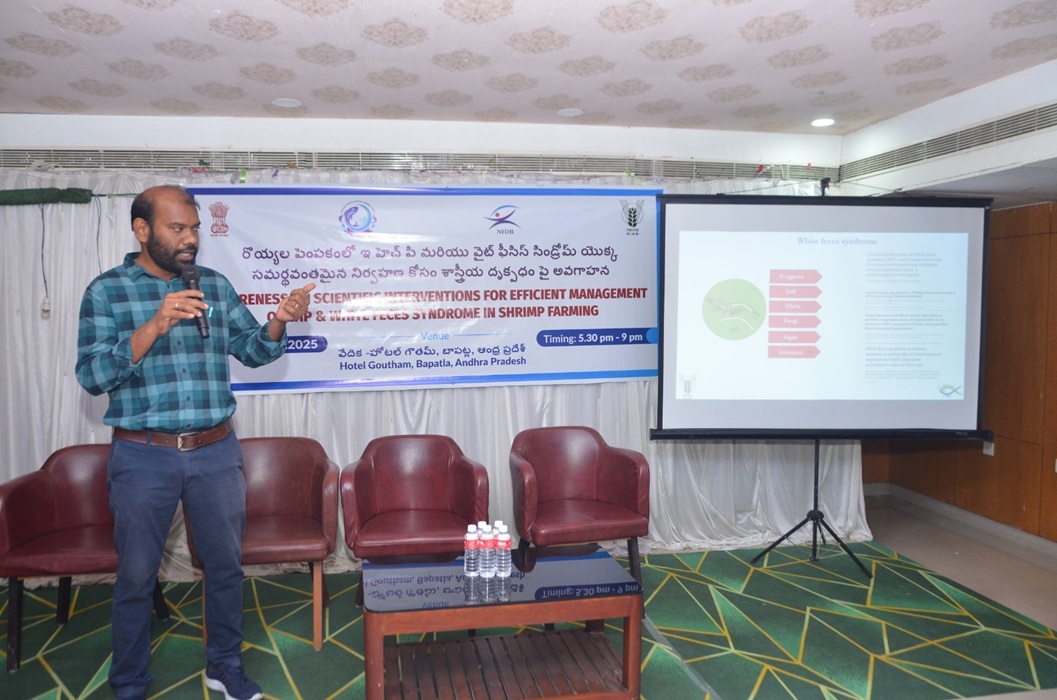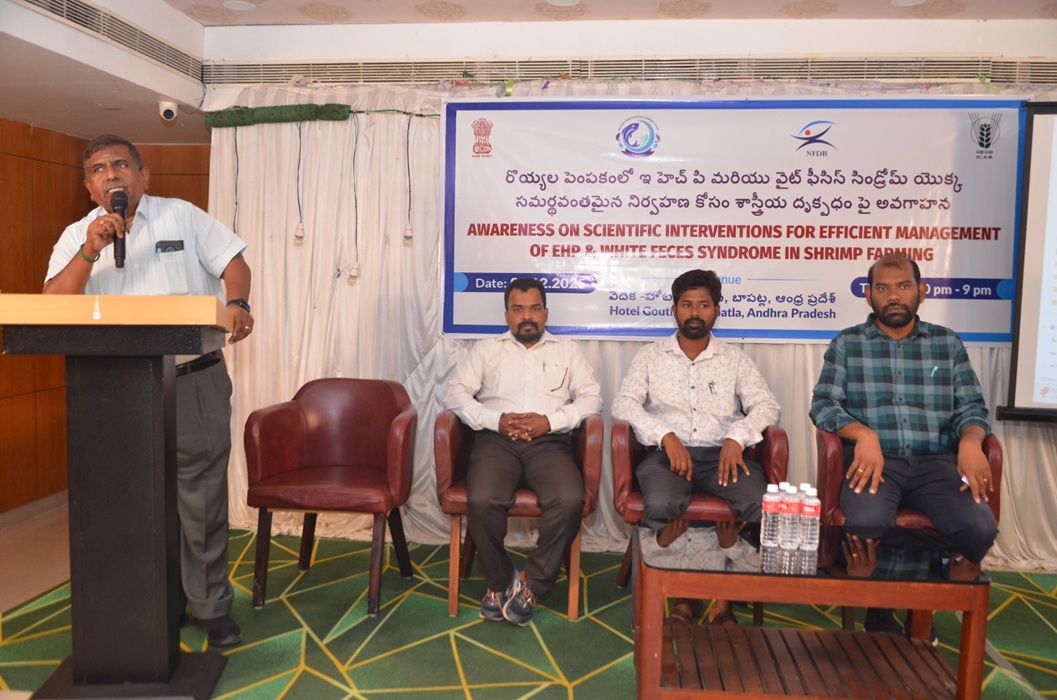 ICAR-Central Institute of Brackishwater Aquaculture conducted sensitization programme at Bapatla, Andhra Pradesh on 09.12.2025 to sensitize shrimp farmers and aqua professionals on shrimp diseases, their prevention and management especially on Microsporodiasis caused by the parasite EHP and the EHP-Cura-I intervention for its management.  About 160 participants comprised of shrimp farmers, field level aqua professionals and fisheries college students participated in the event.