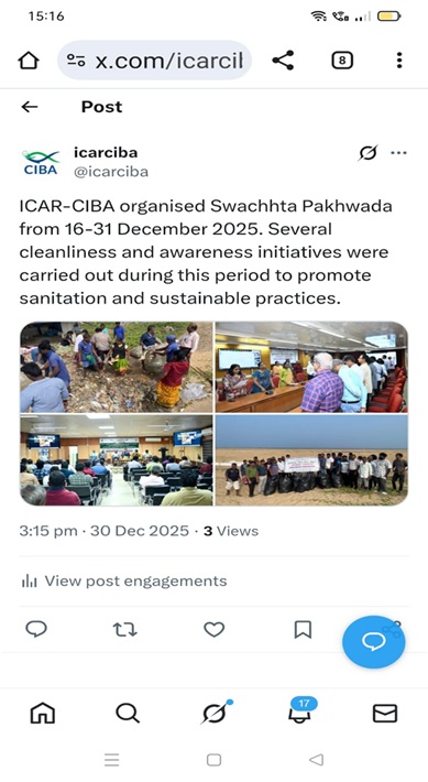ICAR-CIBA successfully organized Swachhta Pakhwada with active participation of scientists, officers, research scholars and other staff members, emphasizing cleanliness, sustainability, and community engagement during 16-31st, December, 2025. The program commenced with the Swachhta Pledge on 16.12.2025, reinforcing the commitment to cleanliness and responsible behavior in both workplace and society. On 17.12.2025 a seminar on “Waste to Wealth” was conducted, highlighting productive ways to convert waste materials into useful products, promoting sustainable practices in daily life. A major focus of the campaign was the weeding out of old files, where obsolete and redundant records were systematically identified and removed, ensuring efficient space utilization and better document management was done on 18.12.2025. On 19.12.2025 the cleanliness and sanitation drive in the office premises ensured de-dusting, cleaning of workstations, proper disposal of waste, and maintenance of hygienic conditions for all employees. In support of environmental conservation, a tree plantation drive was carried out on 22.12.2025 with staff members planting saplings within the office compound, contributing to a greener and cleaner environment.