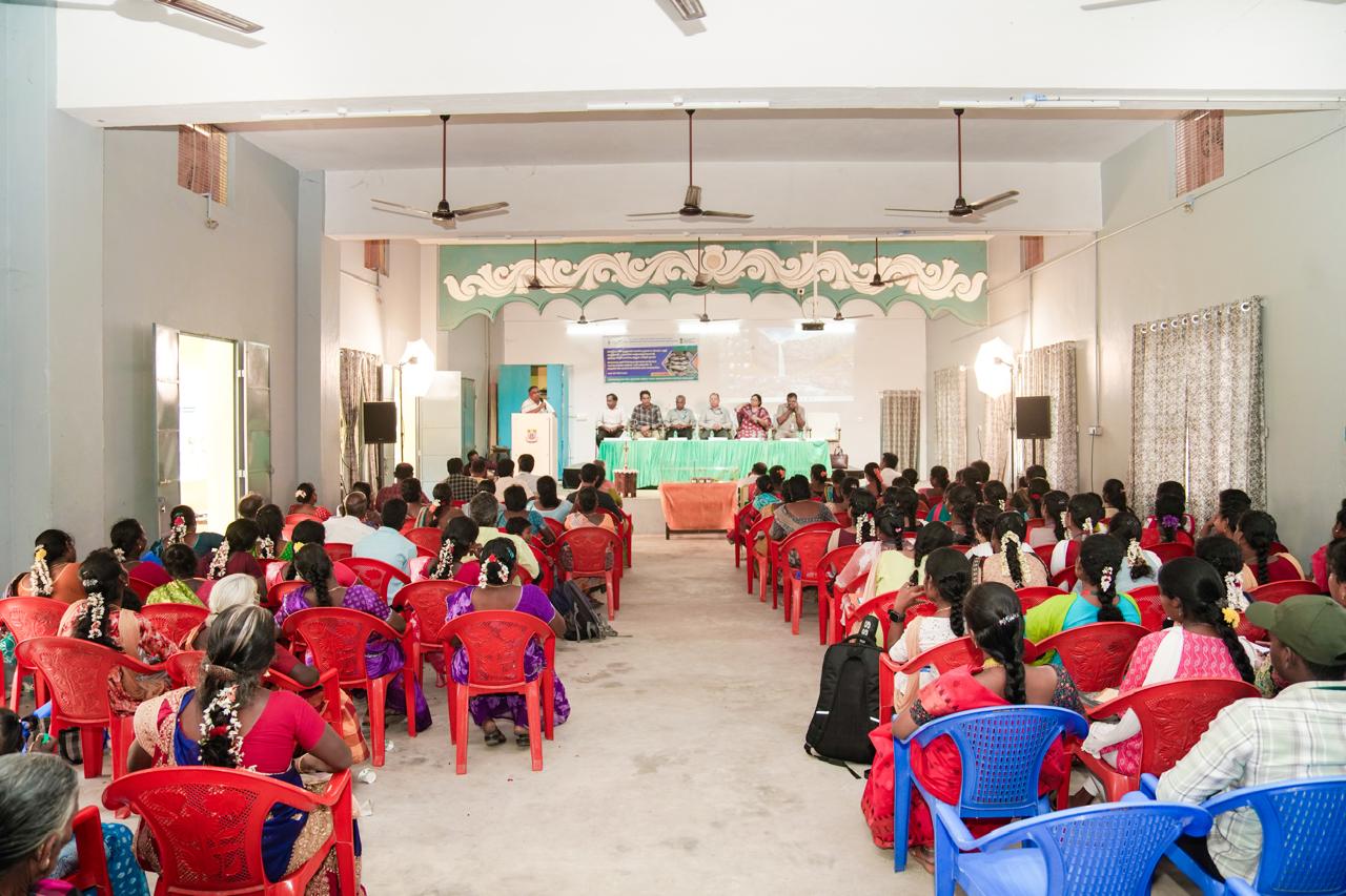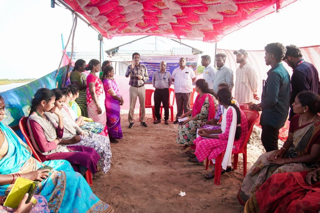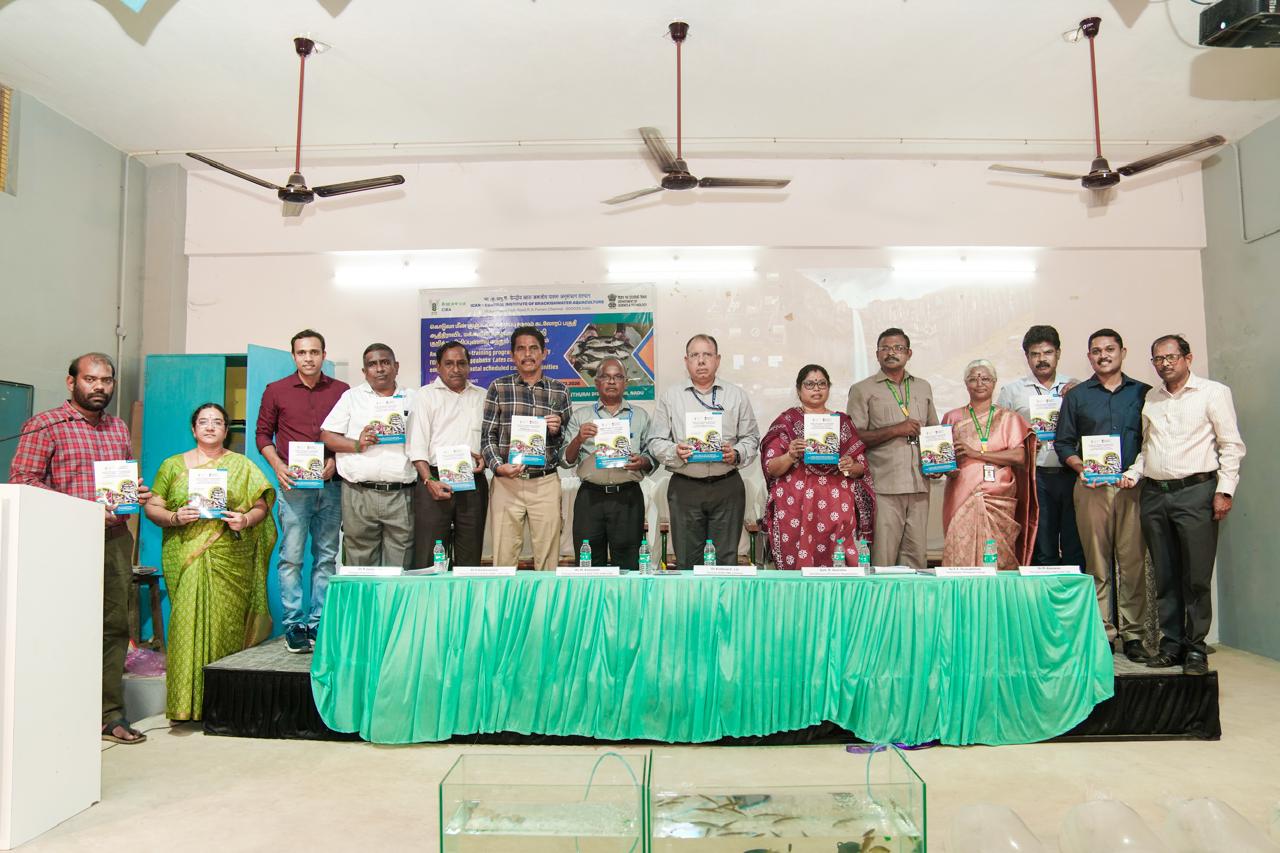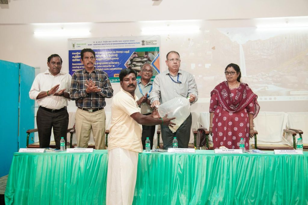 The Chennai based Central Institute of Brackishwater Aquaculture (CIBA) conducted an awareness-cum-training camp on “Nursery rearing of Asian seabass fish as livelihood development and employment generation intervention for the Scheduled Caste families in the coastal villages of Mayiladuthurai district at Poompuhar College, Poompuhar on 25.02.2026. About 150 people from the coastal villages in the Sirkali taluk participated in the training camp. CIBA has developed an economically viable livelihood development model for the landless agricultural labourers of Scheduled Caste community by utilizing the brackishwater common property resources. There is a huge demand for the nursery reared seabass fingerling size seed (10 to 12.5 cm) to stock in the grow out culture pond/cages since hatcheries can supply only fish fry (<2 cm). Therefore, an intermittent phase of nursery rearing which could grow the fish fry to fingerling size of 10 to 12.5 cm in about 75-90 days is a key economic activity. This nursery rearing being a labour-intensive activity provides employment generation and assured income for the beneficiaries.