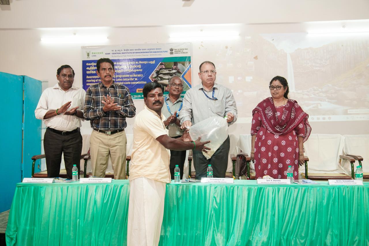 Dr. Kuldeep K Lal, Director, ICAR-CIBA emphasized that CIBA has the complete technology package using small net cages along with key inputs-seed, feed, training for its easy adoption by the villagers. CIBA has been demonstrating this technology in all the coastal states with the active participation of Scheduled Caste families, he highlighted. The director also handed over a sum of Rs.4.68 lakhs revenue earned by the beneficiary groups through Seabass Nursery Rearing during the occasion.