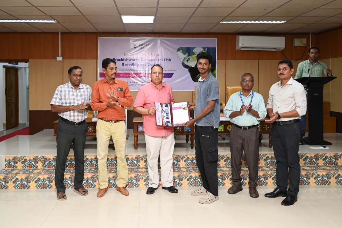 The training sessions covered a wide range of topics, including recent advances in brackishwater finfish aquaculture, ornamental fish resources of India, biology and reproductive characteristics, captive broodstock development, breeding and larval rearing protocols, live feed production and enrichment, nutrition and formulated feeds, hatchery system design, water quality and environmental management, health management strategies, and hapa-based nursery production models for coastal livelihood support. Practical demonstrations enabled participants to gain hands-on experience in hatchery operations and seed production techniques.