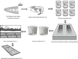 Closing the complex life cycle of closed thelycum shrimp in captivity is one of the fundamental challenges in breeding programs. In the present study, we investigated the sexual maturity, broodstock development, and spawning performance of two generations of captive-reared Indian white shrimp, Penaeus indicus, over 36 months originated from a single stock of wild brooders. The post larvae (GN-1) produced from wild P. indicus (G0) and P.L. (GN-2) produced from captive-reared (GN-1) broodstocks were nursery (1000 PL m-3) and grow-out (12 shrimp m-2) reared, and subsequently raised in broodstock ponds (1 shrimp m-2). The annual salinity and photoperiod in broodstock ponds varied between 20 to 36 ppt, and 11.2 -12.5 L and 11.5-12.8 D hours, respectively. The light intensity varied between 91 ± 6 lux at dusk to 75,358 ± 1719 lux at noon. The size at first impregnation or mating was 16.45 ± 1.7 g (132 DOC) and 17.62 ± 1.9 g (90 DOC), respectively, in GN-1 and GN-2 females. By 220 DOC, 25% of the GN-1 females initiated gonad development, whereas 55% of the GN-2 females recorded developing ovaries or were in stage II at 150 DOC. The broodstock attained an average final body weight of 38.85 ± 1.5 g (GN-1) and 42.65 ± 1.8 g (GN-2) by 360 DOC. The highest (p<0.01) eggs per gram body weight (5137 ± 303 eggs g-1) and hatchability, H (83 ± 0.7%), was recorded in wild broodstocks (G0) followed by GN-2 (1,715 ± 162 eggs g-1; H: 69 ± 2%) and GN-1 (1,476 ± 151 eggs g-1; H: 75 ± 1%). However, captive-reared broodstock had better survival (89-92%) than wild broodstocks (71 ± 0.8%). Further, indoor maturation trial (21 days) using ablated broodstocks (GN-1) revealed 79% of the impregnated broodstocks undergo molting, resulting in the loss of sperm pack and subsequent reduction in mating efficacy to 29%. The average sperm count and percentage of normal sperm also recorded (p<0.05) reduction during the maturation cycle. The data generated in the present investigation can form the baseline information for developing the breeding strategy for the genetic improvement of Indian white shrimp in India.